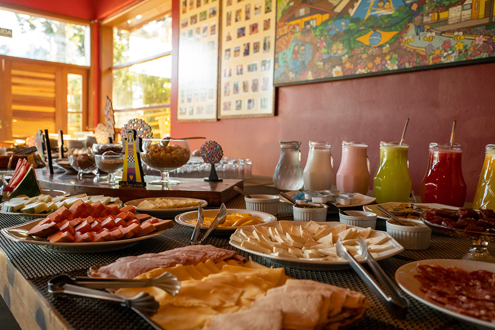 Bolos e tortas feitos aqui mesmo, pães, frios, frutas, sucos e mais.
